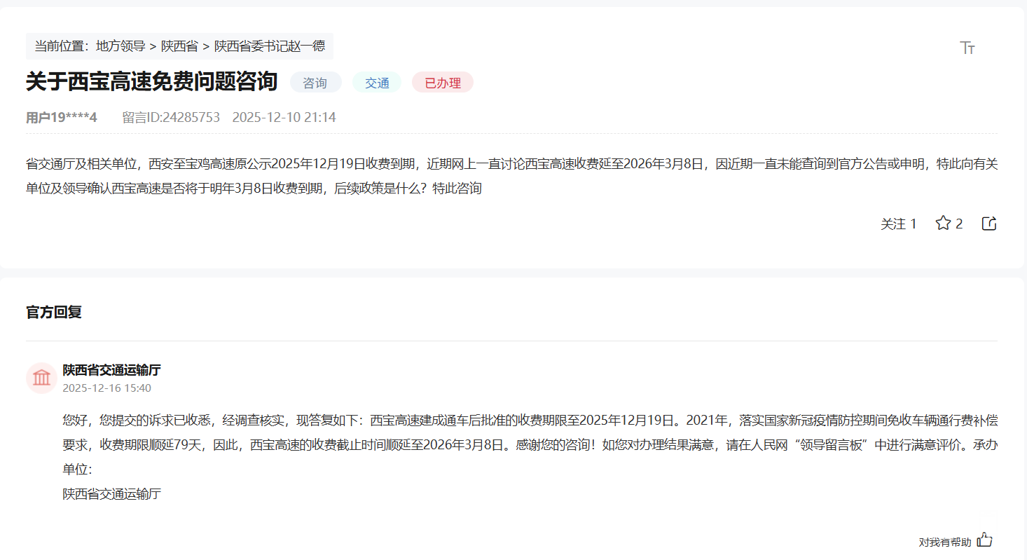 陕西一高速免费时间确定!官方回复→