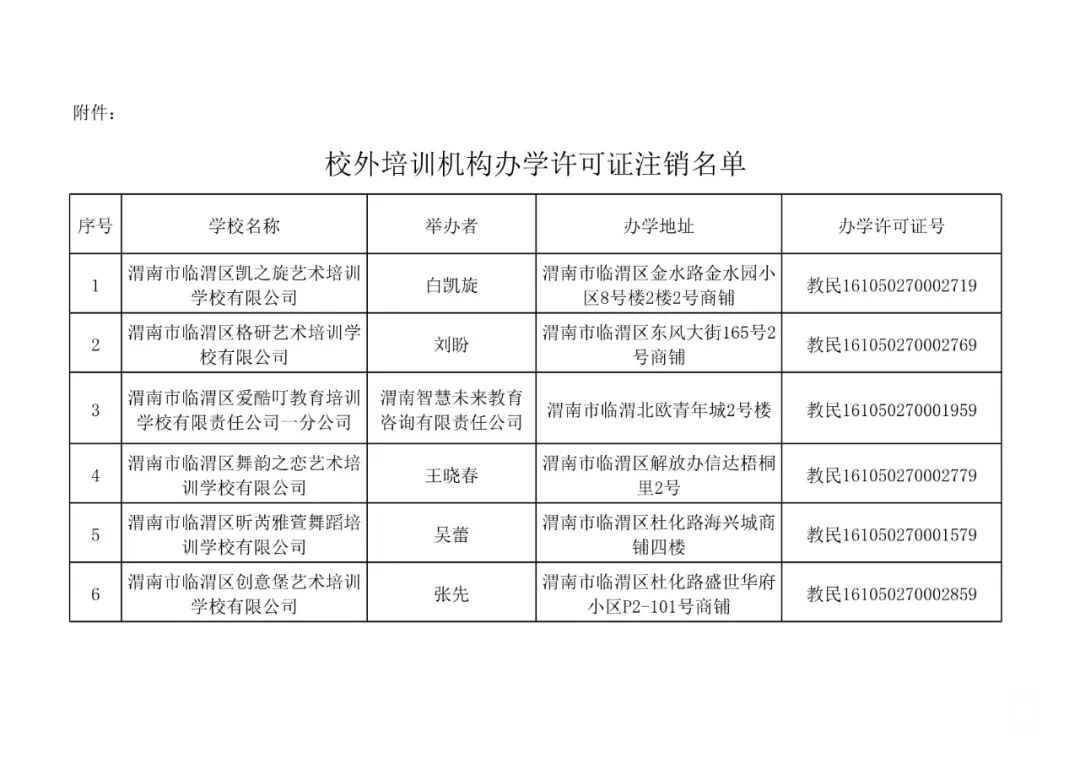 临渭区这11家校外培训机构注销