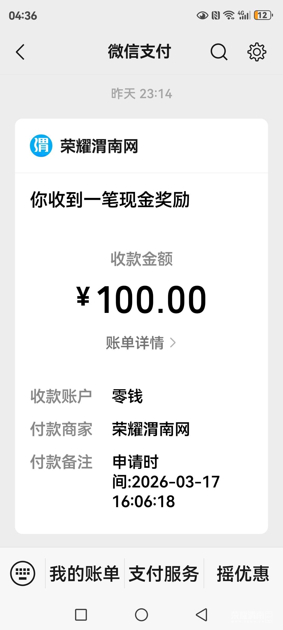 提现100元!真不错!感谢荣耀渭南网