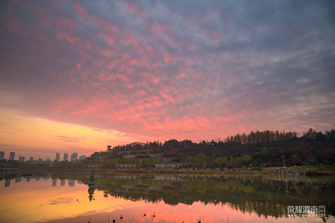 陕西渭南:城区早霞万丈 光芒四射 喜鹊飞翔 和谐安逸