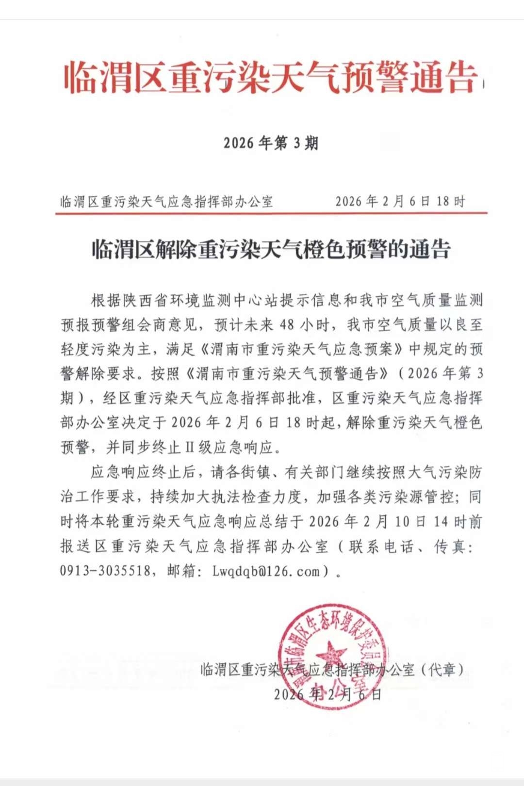 2月6日18时起!渭南一地解除重污染天气橙色预警