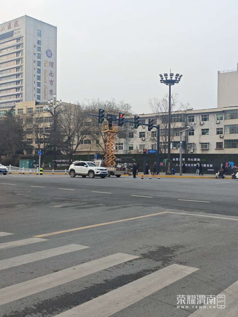 朝阳大街和南塘路十字路口,工人师傅正在对红绿灯进行维修。过往..