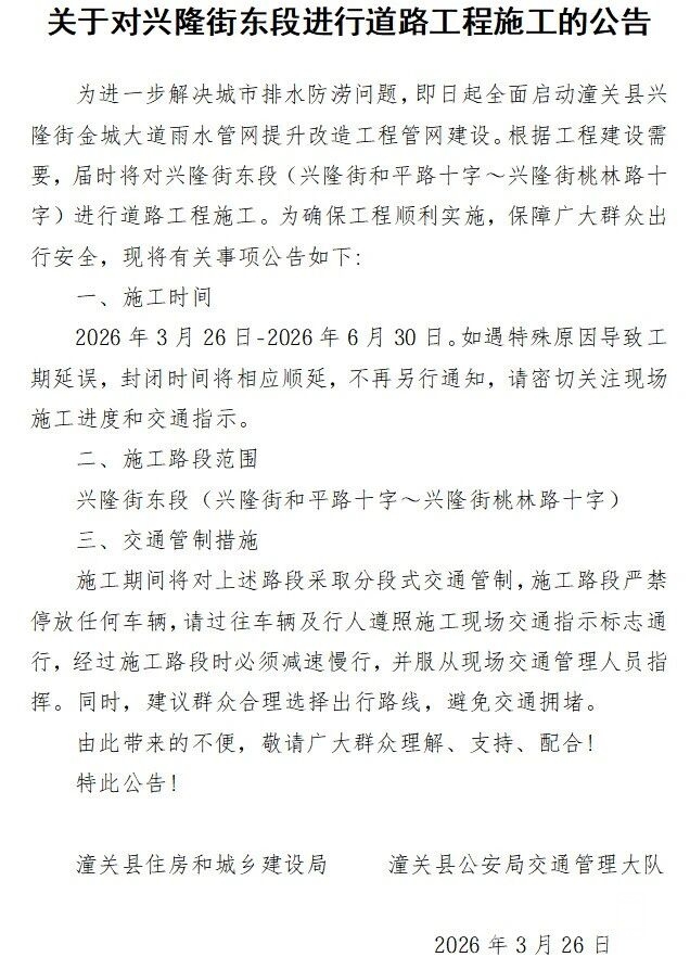 3月26日起,渭南一地这段路进行道路工程施工
