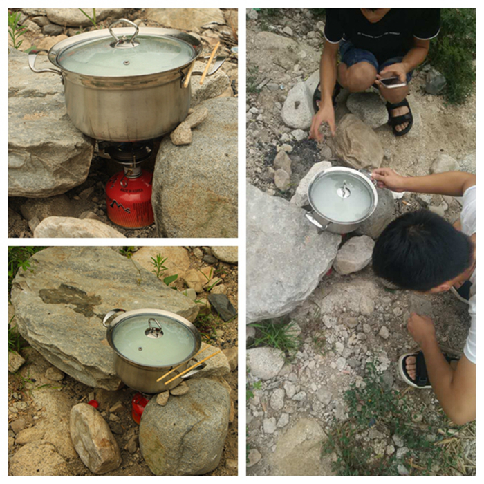 看吧,这就是我带的好东西,丁烷气炉,烧大米粥,这就是最好的烧烤搭档。