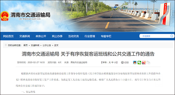 根据陕西省应对新型冠状病毒感染肺炎疫情工作领导小组印发的《关于科学防治精准施策分区分级做好新型冠状肺炎防控工作的指导意见》精神及渭南市做好复工复产工作要求,为满足复工人员返工返岗运输需求,确保广大人民群众安全便捷出行,现将有序恢复我市客运班线和公共交通工作通告如下: