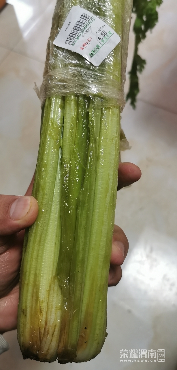 昨天下午去买菜,他们芹菜都是这样子用保鲜膜包好的,因为有两包里面的芹菜是断的,看着像是把坏了的剔除然后这断的的,因为是这,我还专门挑了下,然后结账回来了。今天中午做饭才把保鲜膜这里撕掉一点,就发现芹菜是坏的。而且是把坏的菜包里面,外面和没包的地方完好无损。