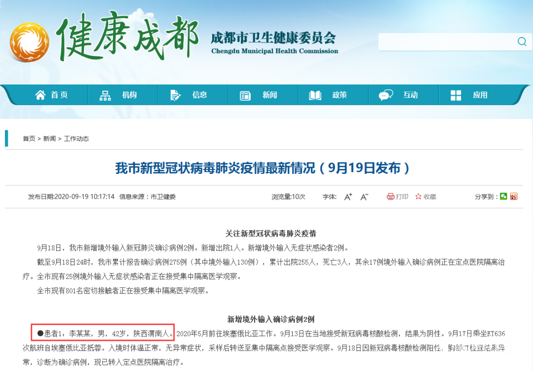 其中确诊病例患者1:李某某,男,42岁,陕西渭南人。2020年5月前往埃塞俄比亚工作。9月13日在当地接受新冠病毒核酸检测,结果为阴性。9月17日乘坐ET636次航班自埃塞俄比亚抵蓉。入境时体温正常,无异常症状,采样后转送至集中隔离点接受医学观察。9月18日因新冠病毒核酸检测阳性,胸部CT检查结果异常,诊断为确诊病例,现已转入定点医院隔离治疗。
