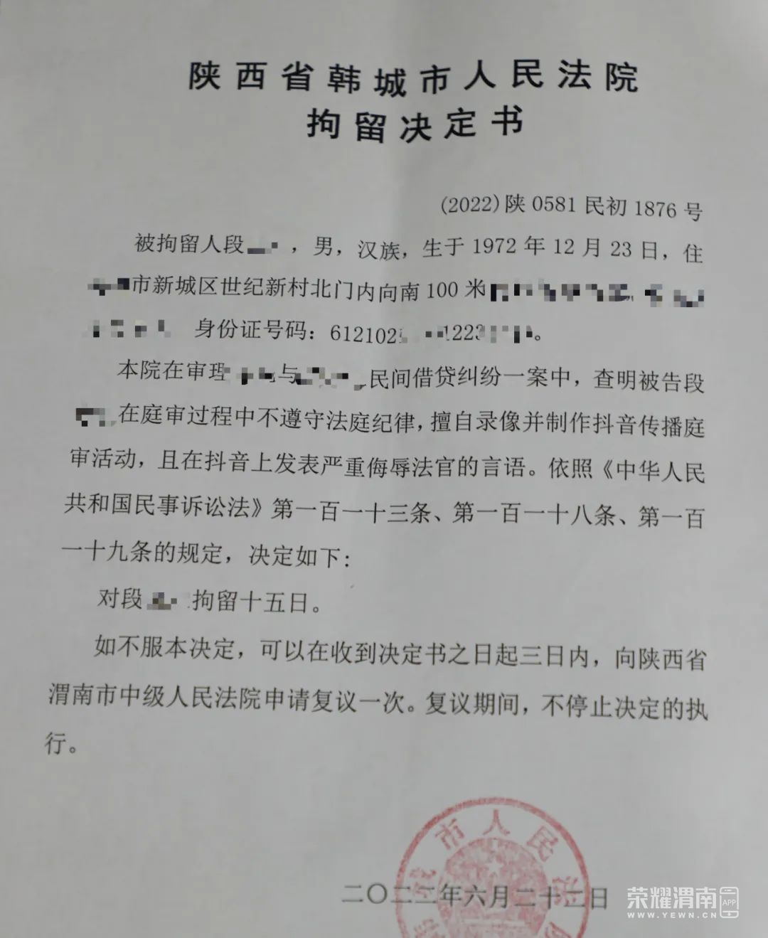 6月22日,韩城市人民法院依法对一名通过抖音恶意侮辱诽谤法官的当事人依法作出拘留十五日的决定,现已交付执行。