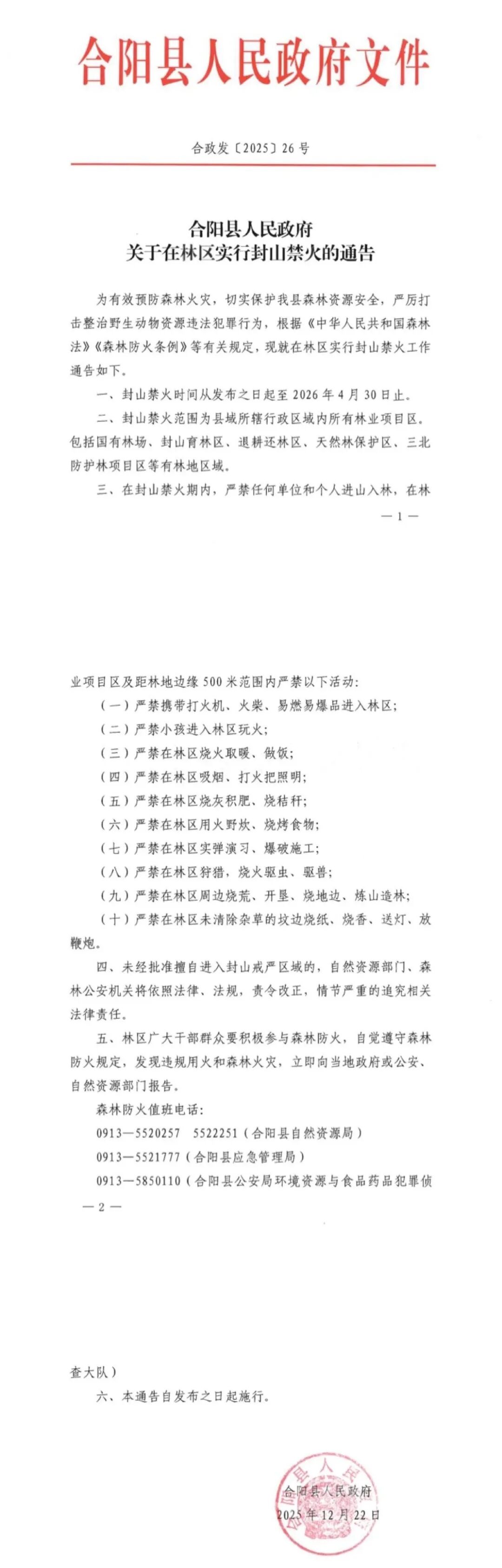 为有效预防森林火灾,切实保护我县森林资源安全,严厉打击整治野生动物资源违法犯罪行为,根据《中华人民共和国森林法》《森林防火条例》等有关规定,现就在林区实行封山禁火工作通告如下。一、封山禁火时间从发布之日起至2026年4月30日止。二、封山禁火范围为县域所辖行政区域内所有林业项目区。包括国有林场、封山育林区、退耕还林区、天然林保护区、三北防护林项目区等有林地区域三、在封山禁火期内,严禁任何单位和个人进山入林,在林业项目区及距林地边缘500米范围内严禁以下活动: