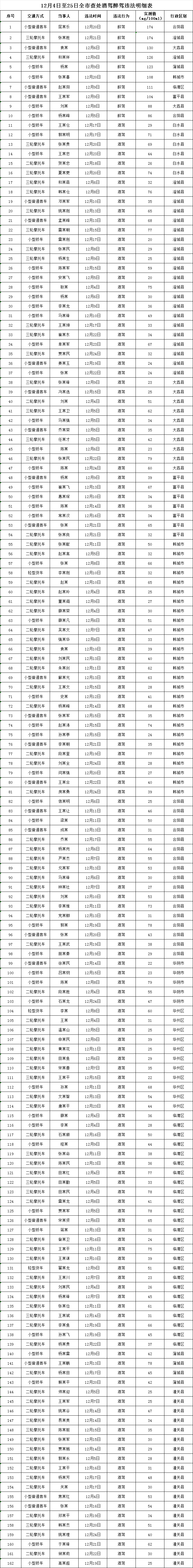 为进一步净化辖区道路交通环境,预防和减少道路交通事故,近期,渭南公安交警强化路面巡逻管控,严查各类交通违法行为,全面化解道路交通风险隐患,守护群众出行平安。现将12月4日至12月25日全市因酒驾醉驾被查处人员名单予以曝光,希望广大交通参与者引以为戒。