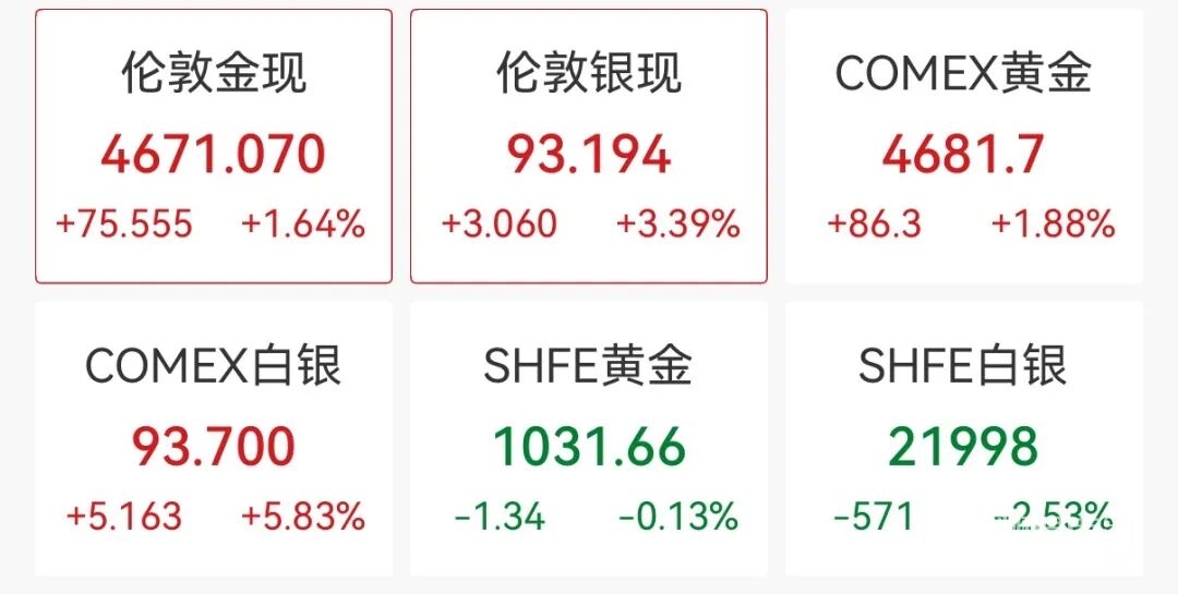 截至发稿,伦敦金现涨1.64%报4671.07美元/盎司,伦敦银现涨3.39%报93.194美元/盎司;COMEX黄金涨1.88%报4681.7美元/盎司,COMEX白银涨5.83%报93.7美元/盎司。