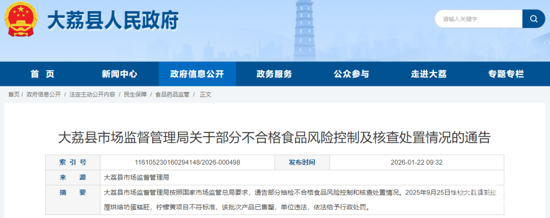 2025年9月25日,我局执法人员在大荔县爱拉屋烘焙坊抽检生产日期为2025年9月23日的蛋糕胚,经陕西联同通用标准技术服务有限公司检验,该批次产品柠檬黄项目不符合GB 2760-2024《食品安全国家标准 食品添加剂使用标准》要求。