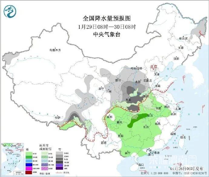 1月26日,据中央气象台消息,预计1月29日至31日,新一股冷空气将影响中东部地区,西北地区、内蒙古中部、华北西部、江淮、江南、华南、西南地区东部将出现4~6℃,局地8℃以上的降温。青藏高原东部、西北地区东部、华北、黄淮西部、江汉、江淮、江南西部等地有小雪或雨夹雪,部分地区有中到大雪,局地暴雪,贵州东部、湖南西部、湖北西部等地局地有冻雨,江南大部、华南等地有小到中雨。