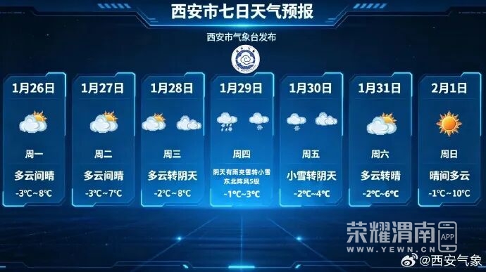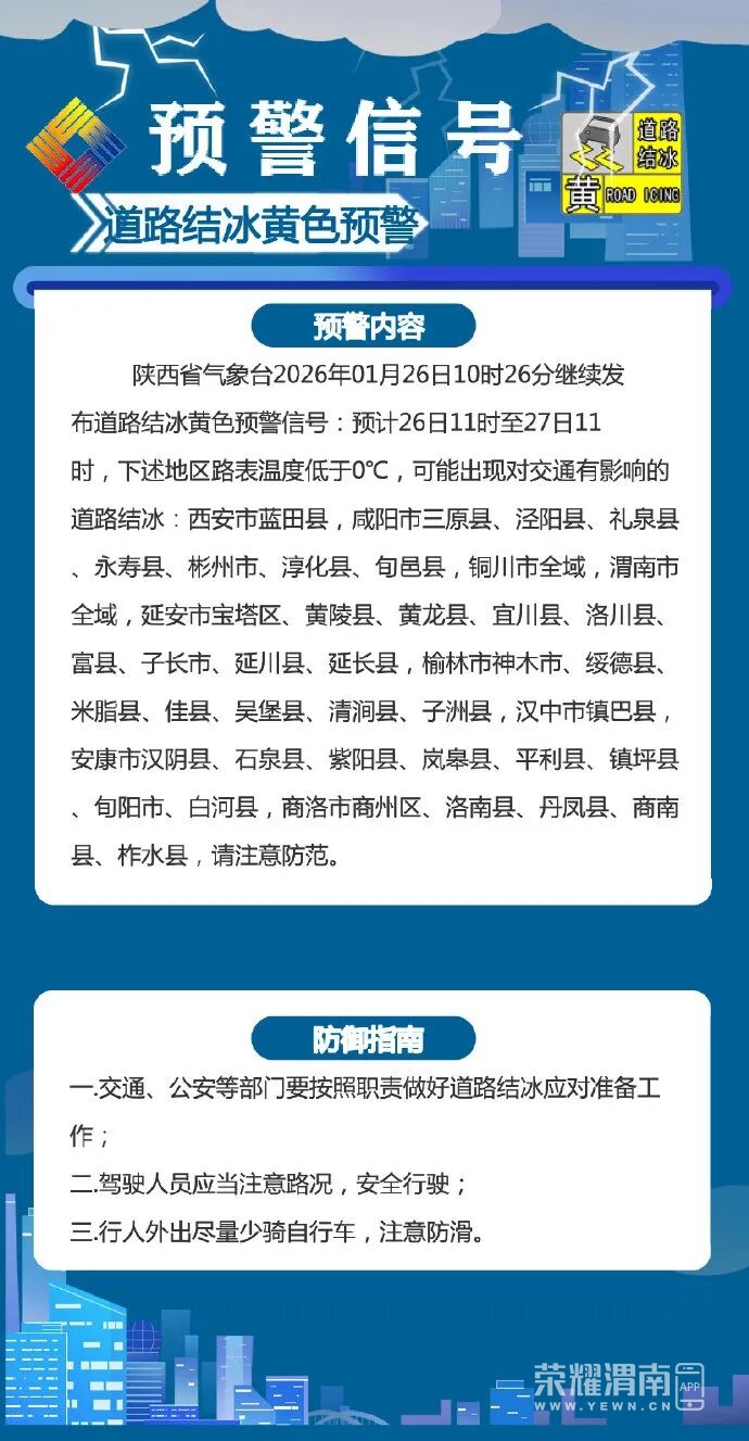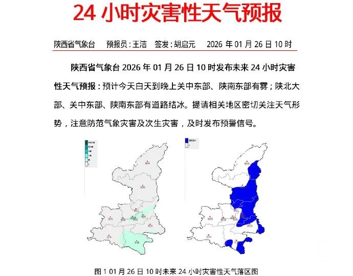 陕西省气象台2026年01月26日10时26分继续发布道路结冰黄色预警信号:预计26日11时至27日11时,下述地区路表温度低于0℃,可能出现对交通有影响的道路结冰:西安市蓝田县,咸阳市三原县、泾阳县、礼泉县、永寿县、彬州市、淳化县、旬邑县,铜川市全域,渭南市全域,延安市宝塔区、黄陵县、黄龙县、宜川县、洛川县、富县、子长市、延川县、延长县,榆林市神木市、绥德县、米脂县、佳县、吴堡县、清涧县、子洲县,汉中市镇巴县,安康市汉阴县、石泉县、紫阳县、岚皋县、平利县、镇坪县、旬阳市、白河县,商洛市商州区、洛南县、丹凤县、商南县、柞水县,请注意防范。陕西省气象台2026年01月26日10时发布未来24小时灾害性天气预报:预计今天白天到晚上关中东部、陕南东部有雾;陕北大部、关中东部、陕南东部有道路结冰。提请相关地区密切关注天气形势,注意防范气象灾害及次生灾害,及时发布预警信号。预计今天白天:陕北、关中多云转晴天,陕南多云间阴天。早晨关中中东部、陕南部分地方有雾,局地大雾。今天晚上:全省多云间阴天。今日全省森林草原火险气象等级为2~3级,需注意防范。