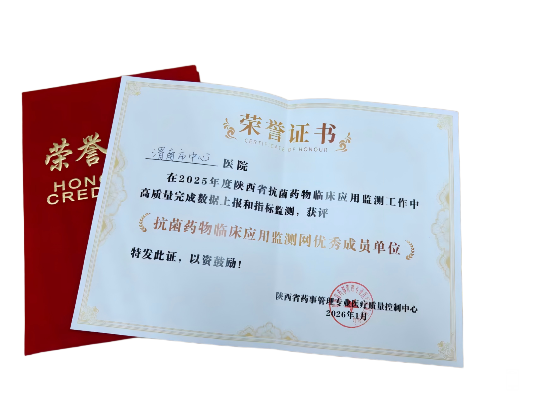 1月23日,在陕西省药事管理专业医疗质量控制中心召开的“2026年陕西省药事质控工作会暨抗菌药物临床应用监测网培训会”上,渭南市中心医院被评为“抗菌药物临床应用监测网优秀成员单位”。