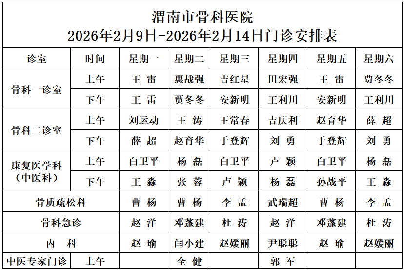 渭南市骨科医院2025年10月9日-10月18日门诊安排表