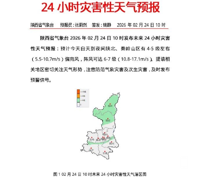 25日:陕北中部、秦岭山区局地有分散性小雨或雨夹雪(0.1~5毫米),秦岭山区东段局地有中雨(10~25毫米);陕南中东部有小雨(0.1~8毫米)。陕北有4级左右偏南风转偏北风,阵风可达6~7级。