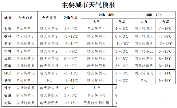 4日:陕北南部、关中北部局地有小雨转小雪或雨夹雪(1~3毫米),关中大部有小雨(2~6毫米),关中西部局地、秦岭山区有小雨转中到大雪(5~10毫米),陕南大部有小到中雨(7~20毫米),巴山沿线有小到中雨转小雪或雨夹雪(8~20毫米),局地中到大雪(3~7毫米)。日平均气温关中西部、陕南下降4℃左右。