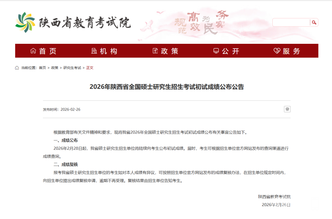 据了解,2026年陕西省全国硕士研究生招生考试初试成绩将于2月28日起公布。