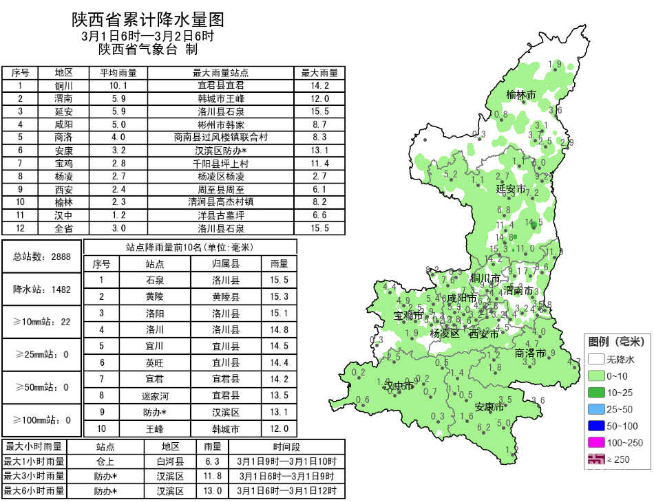3月1日06时—2日06时全省共有105个区县1482个监测站出现降水,最大洛川石泉15.5毫米,其中22站超过10毫米;西安站2.0毫米,西安城区最大4.7毫米(新城区西咸张阁应用)。洛川、宜君出现暴雪,宜川、长武、淳化、旬邑出现大到暴雪,太白、黄龙、黄陵、白水、王益、麟游、华山等地出现中到大雪。3月1日08时监测显示:长武积雪5.0厘米,华山、麟游积雪3.0厘米,洛川积雪2.0厘米,旬邑、王益积雪1.0厘米。各市最大降水量(毫米):榆林清涧8.2,延安洛川15.5,铜川宜君14.2,咸阳彬州8.7,宝鸡千阳11.4,西安周至6.1,渭南韩城12.0,汉中洋县6.6,安康汉滨13.1,商洛商南8.3,杨凌2.7。