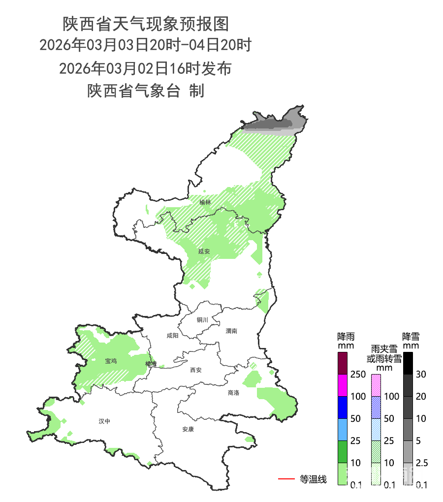 03月03日20时-03月04日20时:全省多云转阴天,陕北北部部分地方有小雨或雨夹雪转小雪(0.1-2mm),北部局地中到大雪(3-8mm),宝鸡部分地方小雨或雨夹雪(0.1-1mm),汉中西部局地、商洛东部局地有分散性小雨(0.1-1mm)。陕北大部、关中东部、秦岭山区有4-5级(5.5-10.7m/s)偏南风或偏东风,阵风可达6-7级(10.8-17.1m/s)。