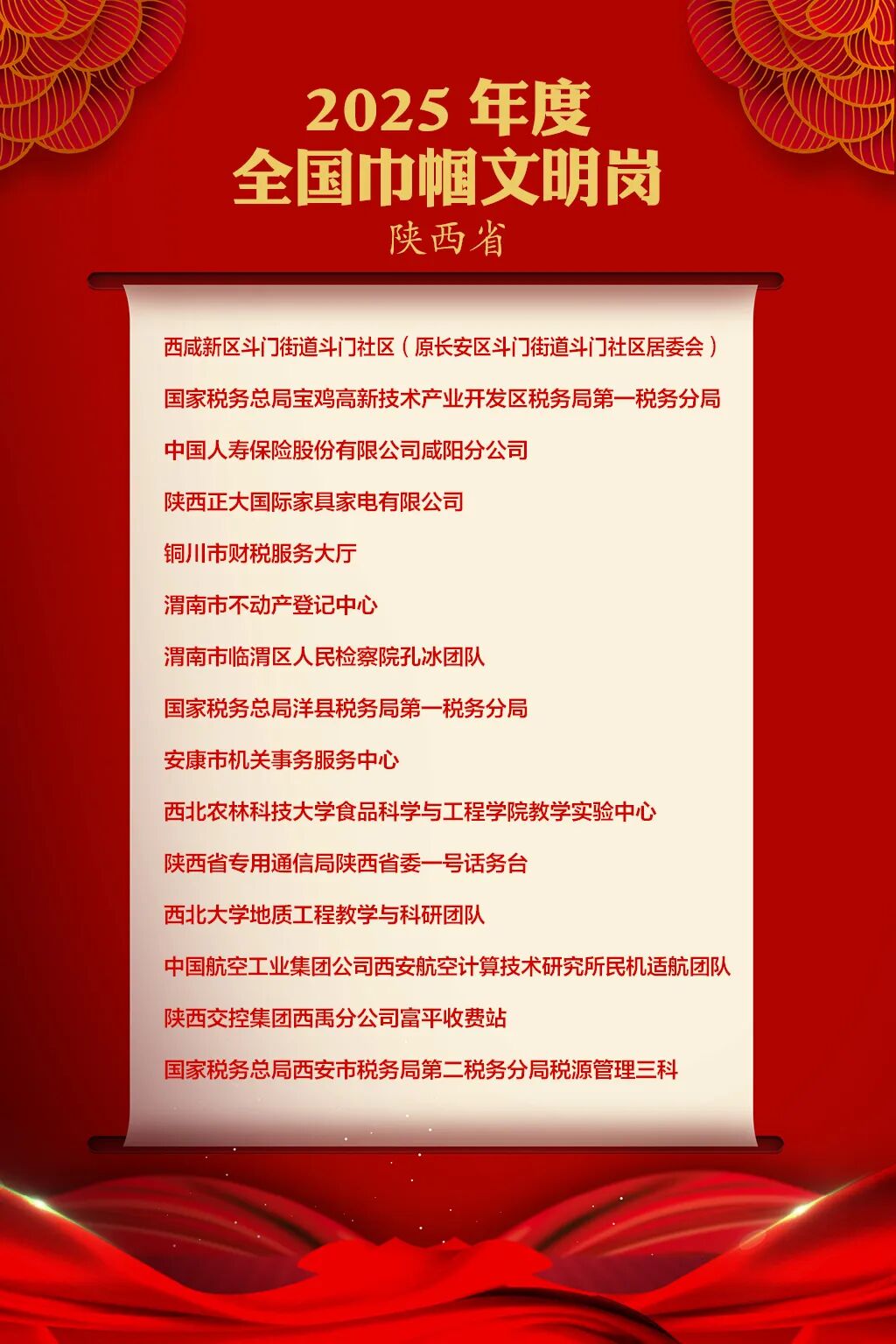 我省周建玲等19人荣获全国三八红旗手称号,西咸新区沣东新城三桥老年公寓等12个集体荣获全国三八红旗集体称号,西咸新区斗门街道斗门社区(原长安区斗门街道斗门社区居委会)等15个单位荣获全国巾帼文明岗称号。