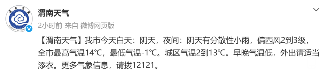 我市今天白天:阴天,夜间:阴天有分散性小雨,偏西风2到3级,全市最高气温14℃,最低气温-1℃。城区气温2到13℃。