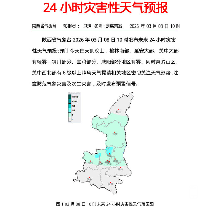 预计今天白天到晚上,榆林南部、延安大部、关中大部有轻雾,铜川部分、宝鸡部分、咸阳部分地区有雾。同时秦岭山区、关中西北部有6级以上阵风天气。