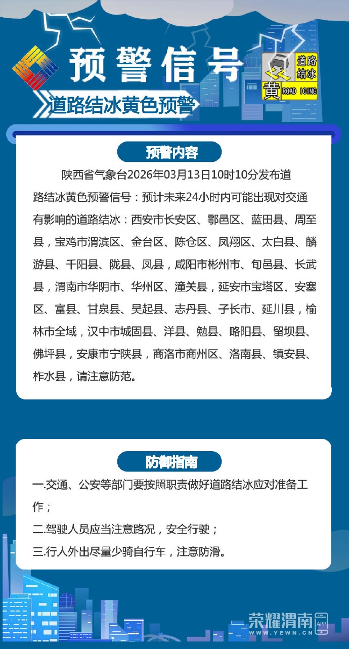 陕西省气象台2026年03月13日10时10分发布道路结冰黄色预警信号:预计未来24小时内可能出现对交通有影响的道路结冰:西安市长安区、鄠邑区、蓝田县、周至县,宝鸡市渭滨区、金台区、陈仓区、凤翔区、太白县、麟游县、千阳县、陇县、凤县,咸阳市彬州市、旬邑县、长武县,渭南市华阴市、华州区、潼关县,延安市宝塔区、安塞区、富县、甘泉县、吴起县、志丹县、子长市、延川县,榆林市全域,汉中市城固县、洋县、勉县、略阳县、留坝县、佛坪县,安康市宁陕县,商洛市商州区、洛南县、镇安县、柞水县,请注意防范。