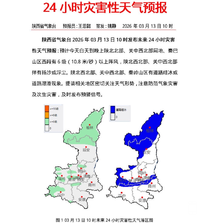 陕西省气象台2026年03月13日10时发布未来24小时灾害性天气预报:预计今天白天到晚上陕北北部、关中西北部局地、秦巴山区西段有6级(10.8米/秒)以上阵风,陕北西北部、关中西北部伴有扬沙或浮尘。陕北西北部、关中西北部、秦岭山区有道路结冰或道路湿滑现象。提请相关地区密切关注天气形势,注意防范气象灾害及次生灾害,及时发布预警信号。