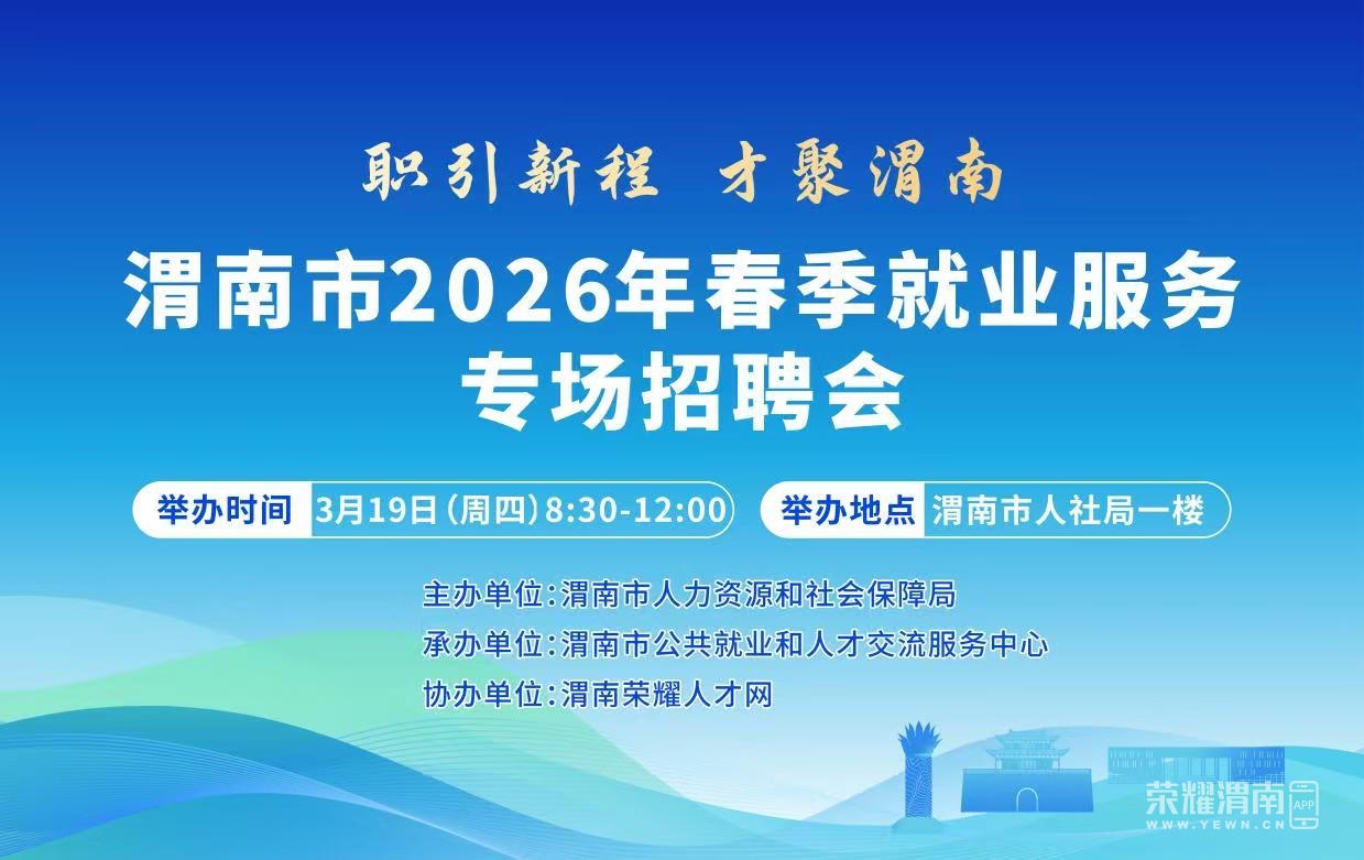 为深入贯彻落实稳就业、保民生决策部署,助力广大求职者高质量充分就业,满足用人单位春季引才需求,由渭南市人力资源和社会保障局主办,渭南市公共就业和人才交流服务中心承办,渭南荣耀人才网协办的“职引新程 才聚渭南”2026年春季就业服务专场招聘会将于3月19日(周四)8:30—12:00在渭南市人社局一楼举行。