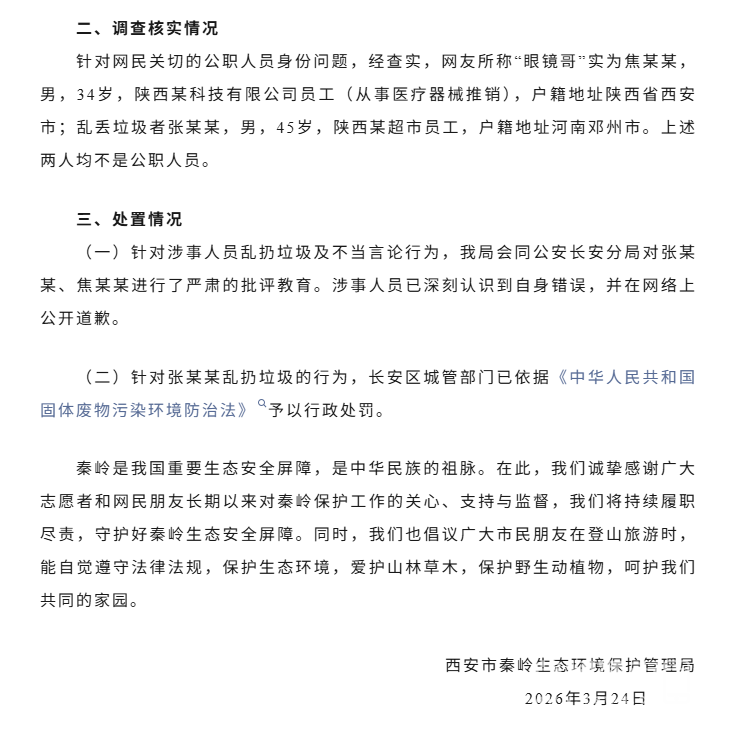 针对网民关切的公职人员身份问题,经查实,网友所称“眼镜哥”实为焦某某,男,34岁,陕西某科技有限公司员工(从事医疗器械推销),户籍地址陕西省西安市;乱丢垃圾者张某某,男,45岁,陕西某超市员工,户籍地址河南邓州市。上述两人均不是公职人员。