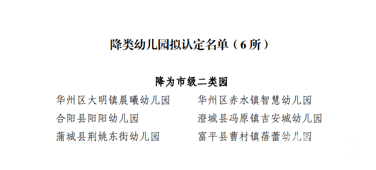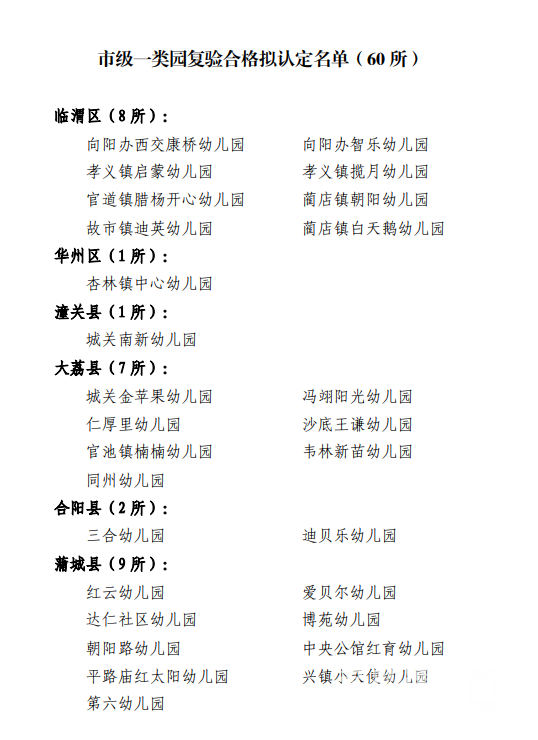 按照《渭南市幼儿园评估分类认定管理办法》,市教育局组织力量对满五年的市级一类园和申报的入(升)类园进行了评估,根据评估结果,60所市级一类园复验合格;6所市级一类园降为市级二类园;拟认定市级一类园2所、市级二类园6所、市级三类幼儿园1所;现将拟认定名单予以公示(见附件1-3)。