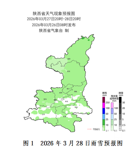 受高空槽东移影响,预计3月27日夜间至30日我省有一次大范围雨雪降温吹风天气过程。全省大部有小雨,秦岭山区东段局地、巴山西段局地有中雨,陕北西部局地、关中西部局地、秦岭山区西段有雨夹雪或小到中雪,局地(西安市周至县、宝鸡市太白县)有大雪。