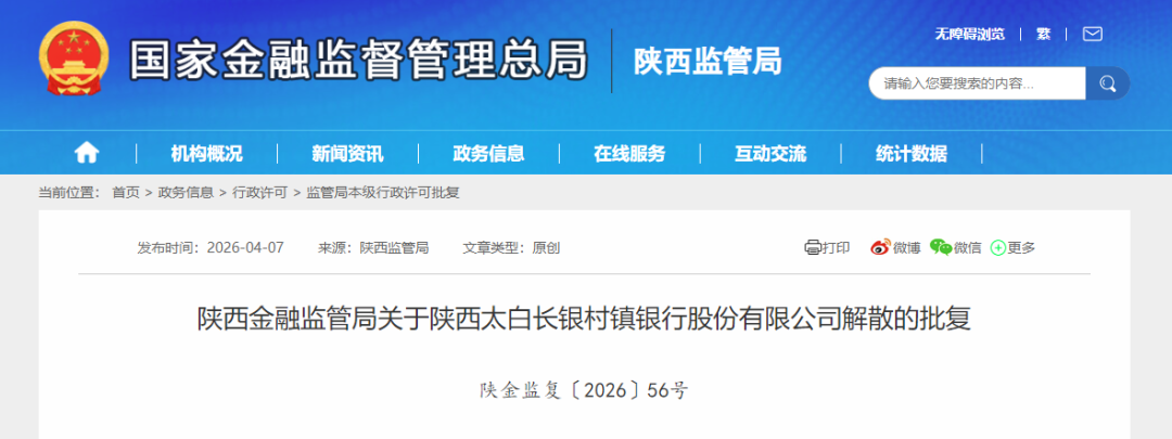 近日,国家金融监督管理总局陕西监管局正式批复,同意解散陕西太白长银村镇银行股份有限公司。具体内容如下:
