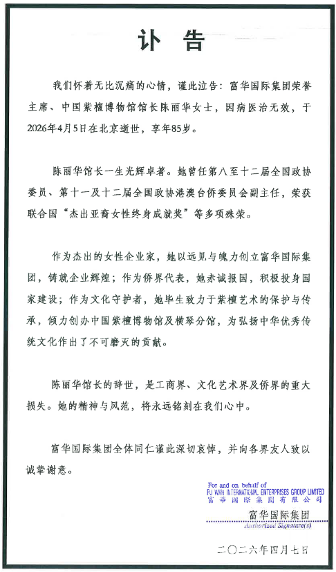 我们怀着无比沉痛的心情,谨此泣告:富华国际集团荣誉主席、中国紫檀博物馆馆长陈丽华女士,因病医治无效,于2026年4月5日在北京逝世,享年85岁。
