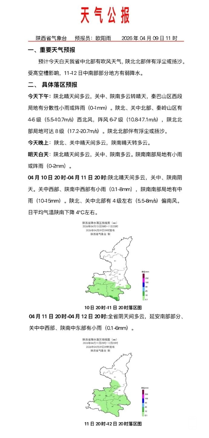 预计今天白天陕西省中北部有吹风天气,陕北北部伴有浮尘或扬沙。受高空槽影响,11-12日中南部部分地方有弱降水。