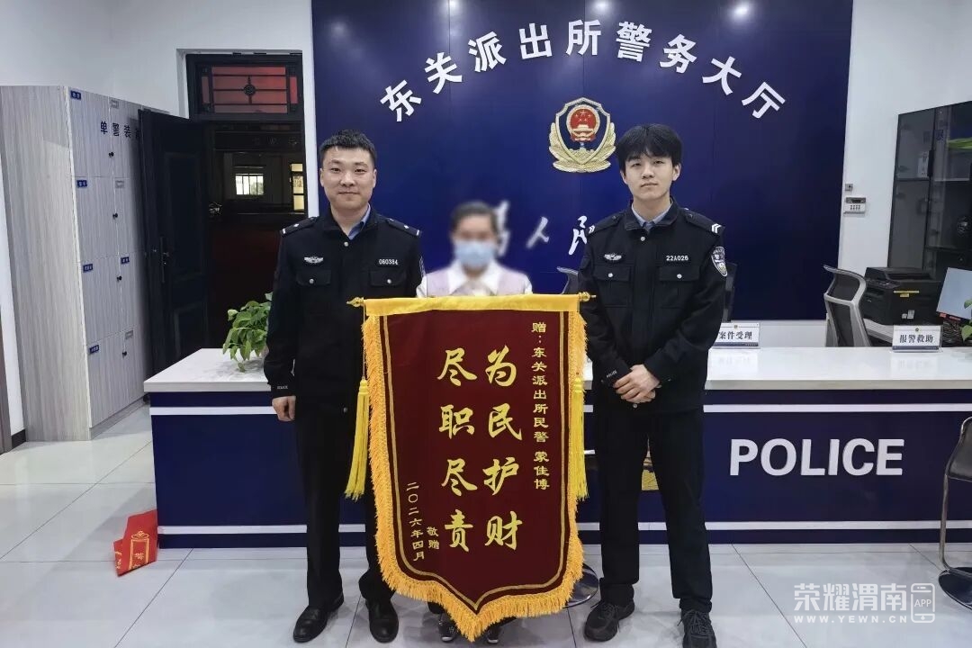 4月10日,辖区居民王女士来到东关派出所,将一面印有“为民护财 尽职尽责”的锦旗送给民警,以此表达对民警成功阻断诈骗、守护其财产安全的衷心感谢,