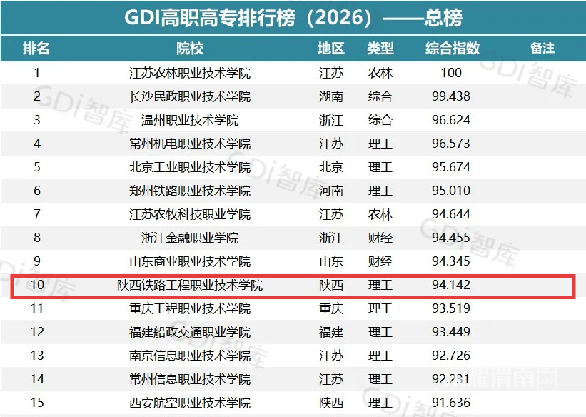 在“GDI高职高专排行榜(2026)”名单中,学校以综合得分94.142排在全国第10位,陕西第1位。