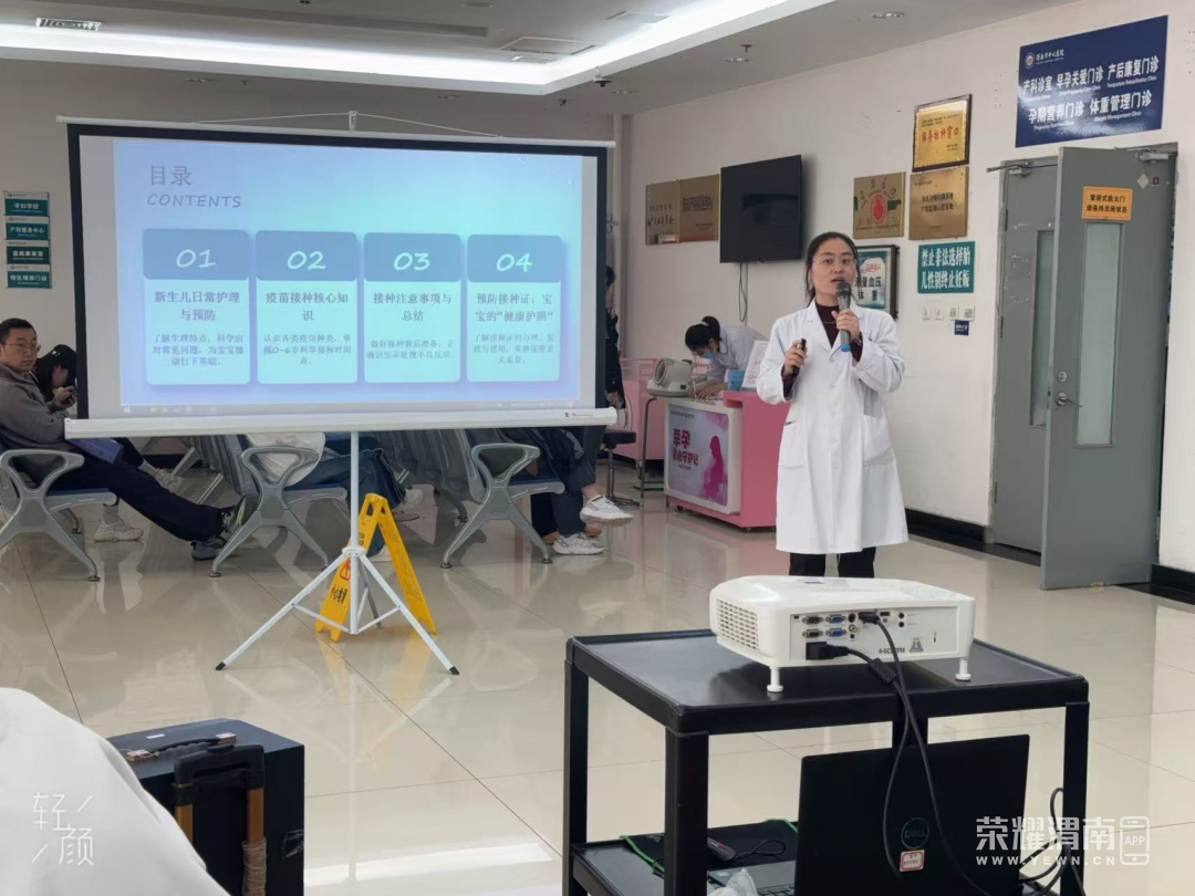 在住院部,宣教重点面向新生儿家庭。课堂内容聚焦于新生儿出生后24小时内需接种的乙肝疫苗和卡介苗,详细介绍了接种的法定要求、必要性与禁忌症筛查标准,并讲解了接种后的局部护理、黄疸监测等注意事项。同时,工作人员还对“陕西新生儿一件事”集成服务中涉及的接种预约、信息登记等便民政策进行了解读,并在答疑环节为新手父母提供一对一指导,帮助他们掌握相关知识,缓解焦虑情绪。