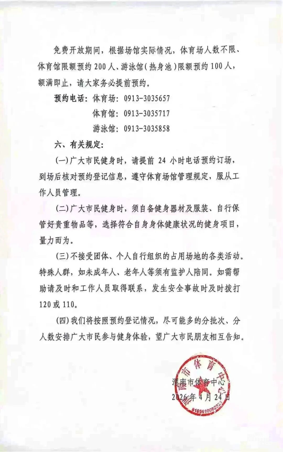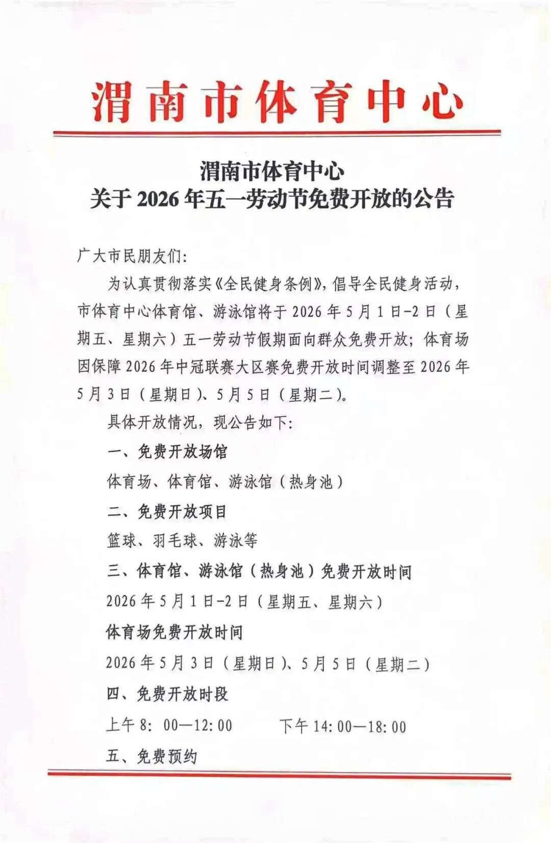 渭南市体育中心关于2026年五一劳动节免费开放的公告