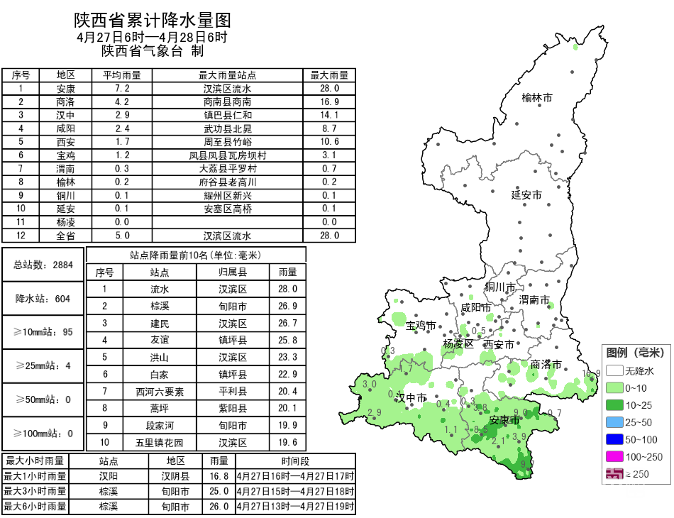昨日我省大部以阴天间多云天气为主,陕南南部、秦岭山区西部局地共48个区县605个监测站出现降水,最大汉滨区流水28.0毫米,其中4站大雨,91站中雨,509站小雨。陕南南部部分地方监测到雷电总闪5931次。