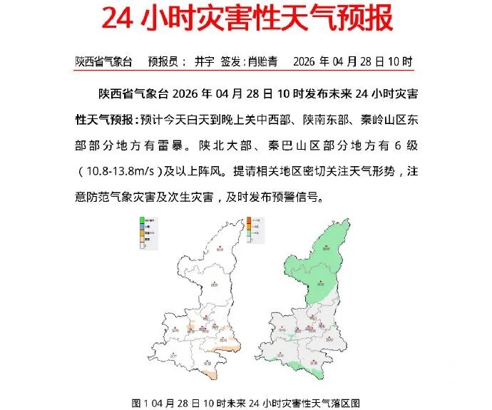 预计今天白天到晚上关中西部、陕南东部、秦岭山区东部部分地方有雷暴。陕北大部、秦巴山区部分地方有6级(10.8-13.8m/s)及以上阵风。提请相关地区密切关注天气形势,注意防范气象灾害及次生灾害,及时发布预警信号。