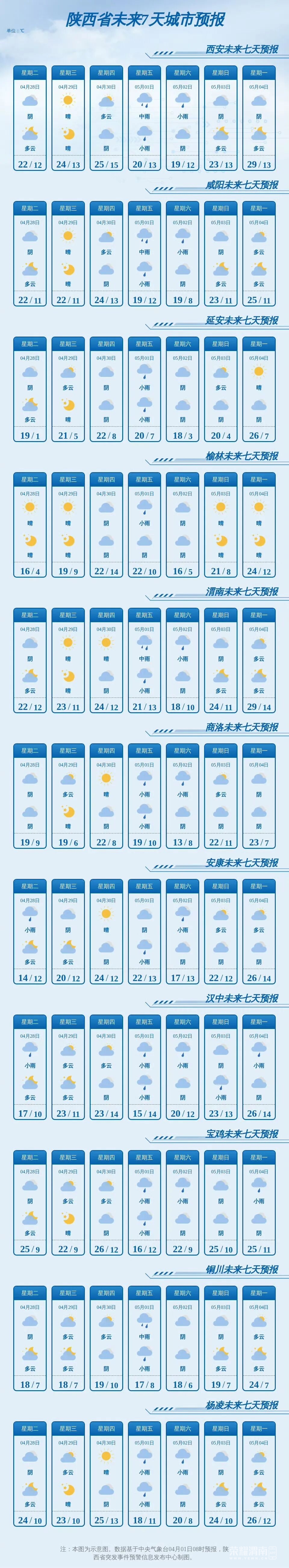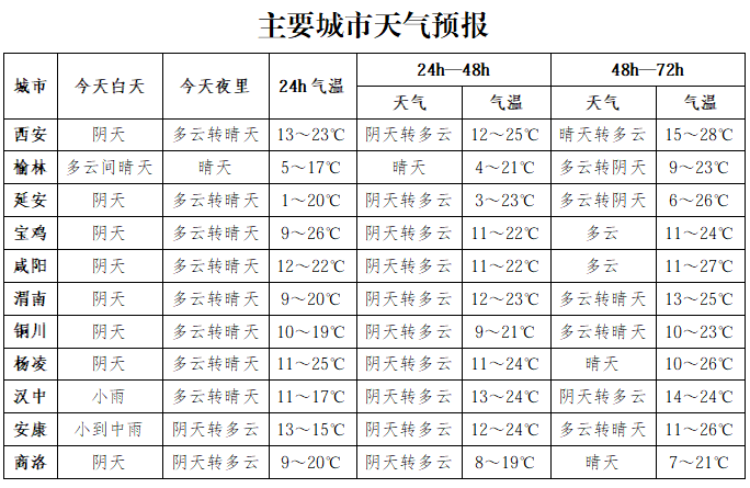 5月1日:全省阴天,陕北大部、关中有小到中雨,陕南有小雨或阵雨。