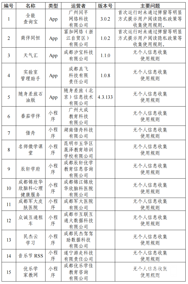 一、全能查询宝、商伴同恒等15款App无个人信息收集使用规则或在首次运行时未通过弹窗等明显方式提示用户阅读个人信息收集使用规则(详见下表)。