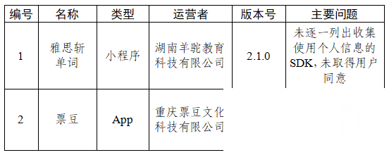二、雅思斩单词、票豆等2款App未逐一列出收集使用个人信息的SDK,未取得用户同意(详见下表)。