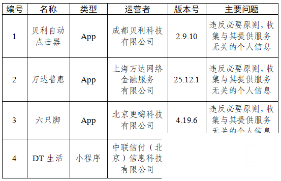 三、贝利自动点击器、万达普惠等4款App违反必要原则,收集与其提供的服务无关的个人信息(详见下表)。