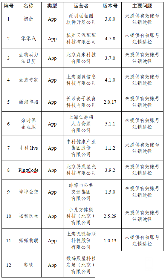 四、初念、零零汽等12款App未提供有效账号注销途径或为用户注销账号设置不合理条件(详见下表)。