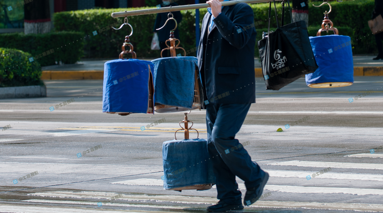 肩扛手提鸟笼子的大爷
