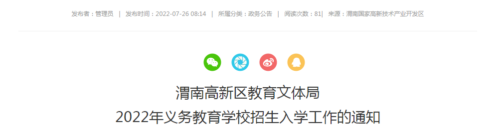 为深入贯彻落实《中共中央国务院关于深化教育教学改革全面提高义务教育质量的意见》精神,进一步规范义务教育招生行为,促进教育公平,提高教育治理能力,营造良好教育生态,按照《渭南市教育局关于做好2022年全市义务教育学校招生入学工作的通知》精神,现就做好我区2022年义务教育免试就近入学工作通知如下: